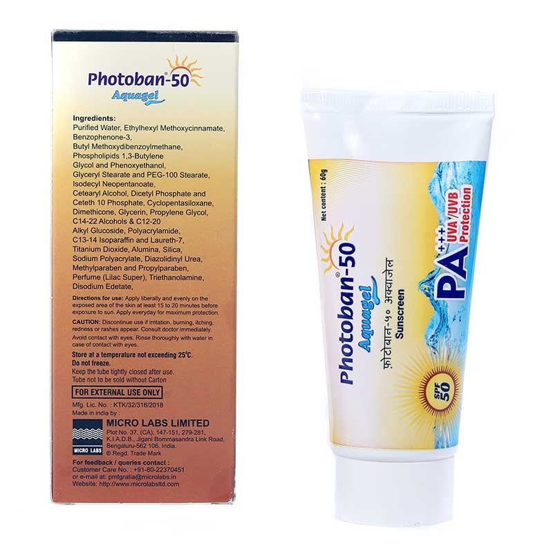 1) Information about Photoban Photoban SPF 50 Aqua 2) Sunscreen PA+++ | UVA & UVB Protection Gel 3) Photoban SPF 50 Aqua Gel is a sunscreen gel that protects the skin from the sun harmful 4) UVA and UVB rays with SPF 50 and PA+++ protection.